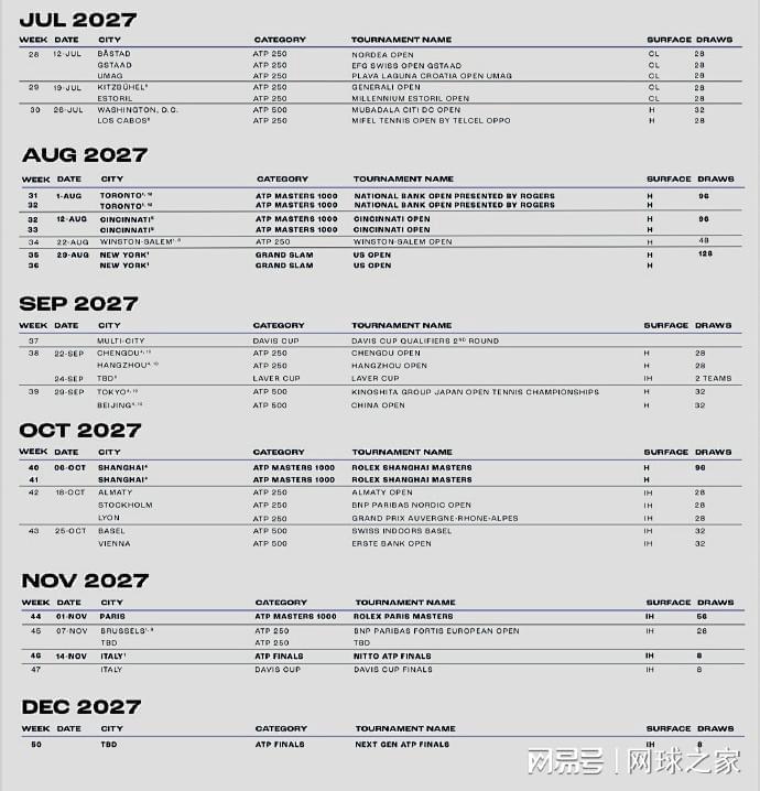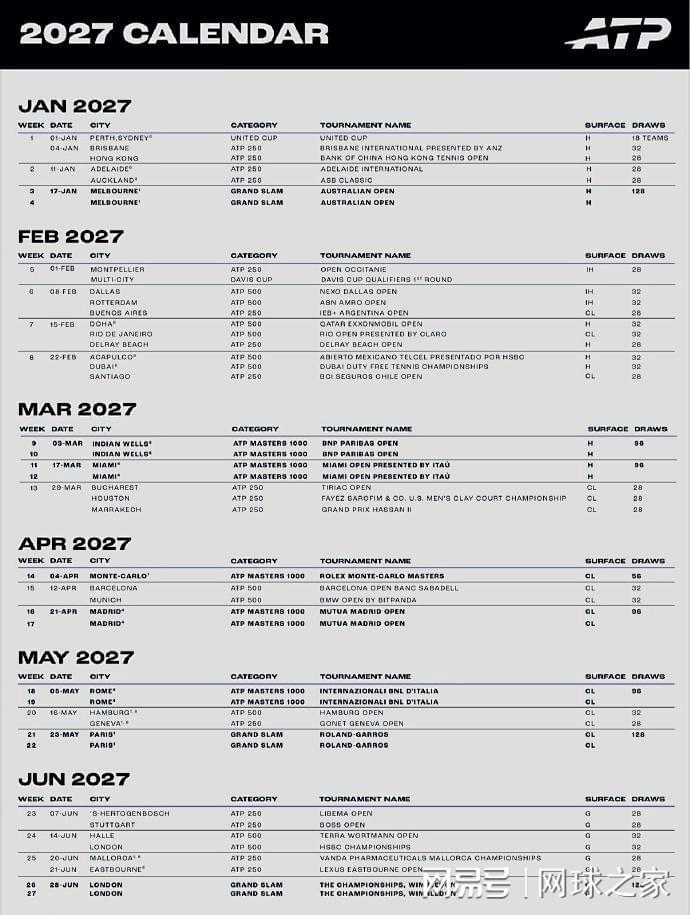 我们再来关注其它消息。北京时间今晨,ATP公布了2027赛季巡回赛的赛历。2027赛季,ATP巡回赛将覆盖全球29个国家和地区,共举办59项赛事,另加四项大满贯赛事,其中有7站大师赛将采用升级后的12天赛制。具体请看附图。